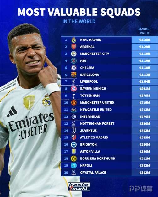 2025年接近尾声,德转列出了全球球队身价排名前二十,皇马以13.8亿欧排名第一,阿森纳12.9亿欧第二,曼城、巴黎分列第三、第四。